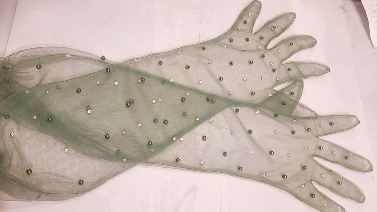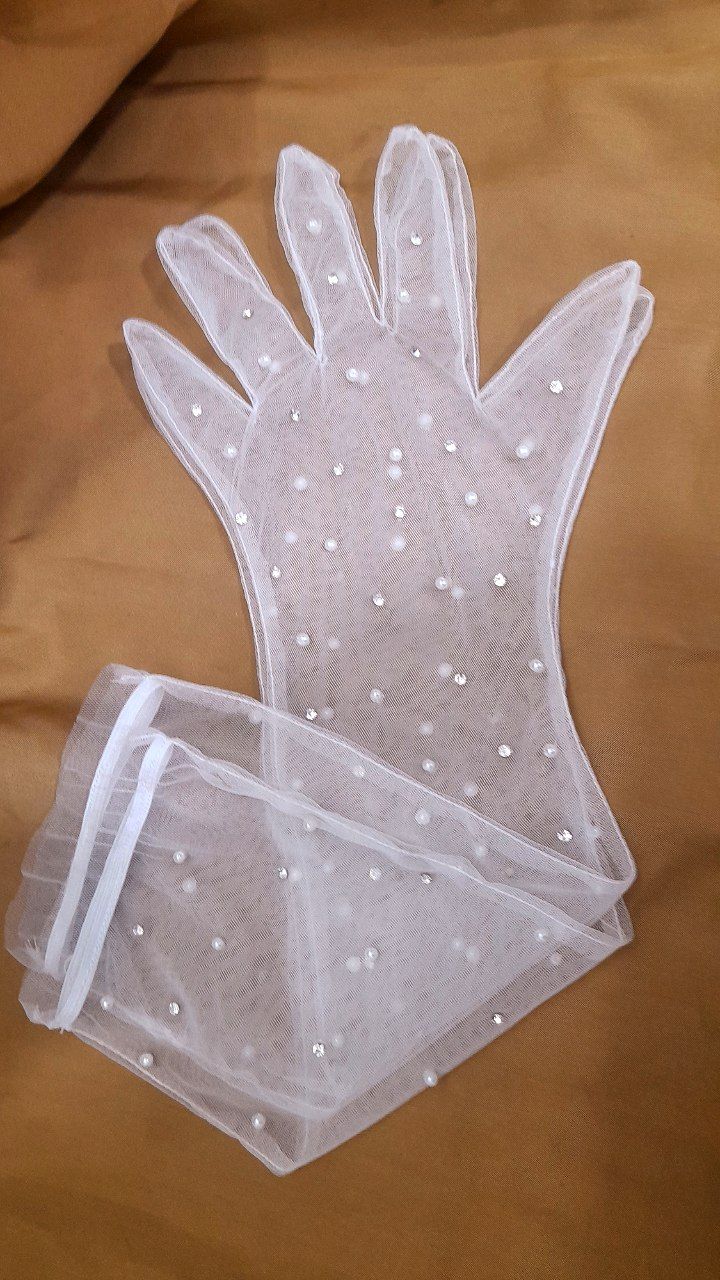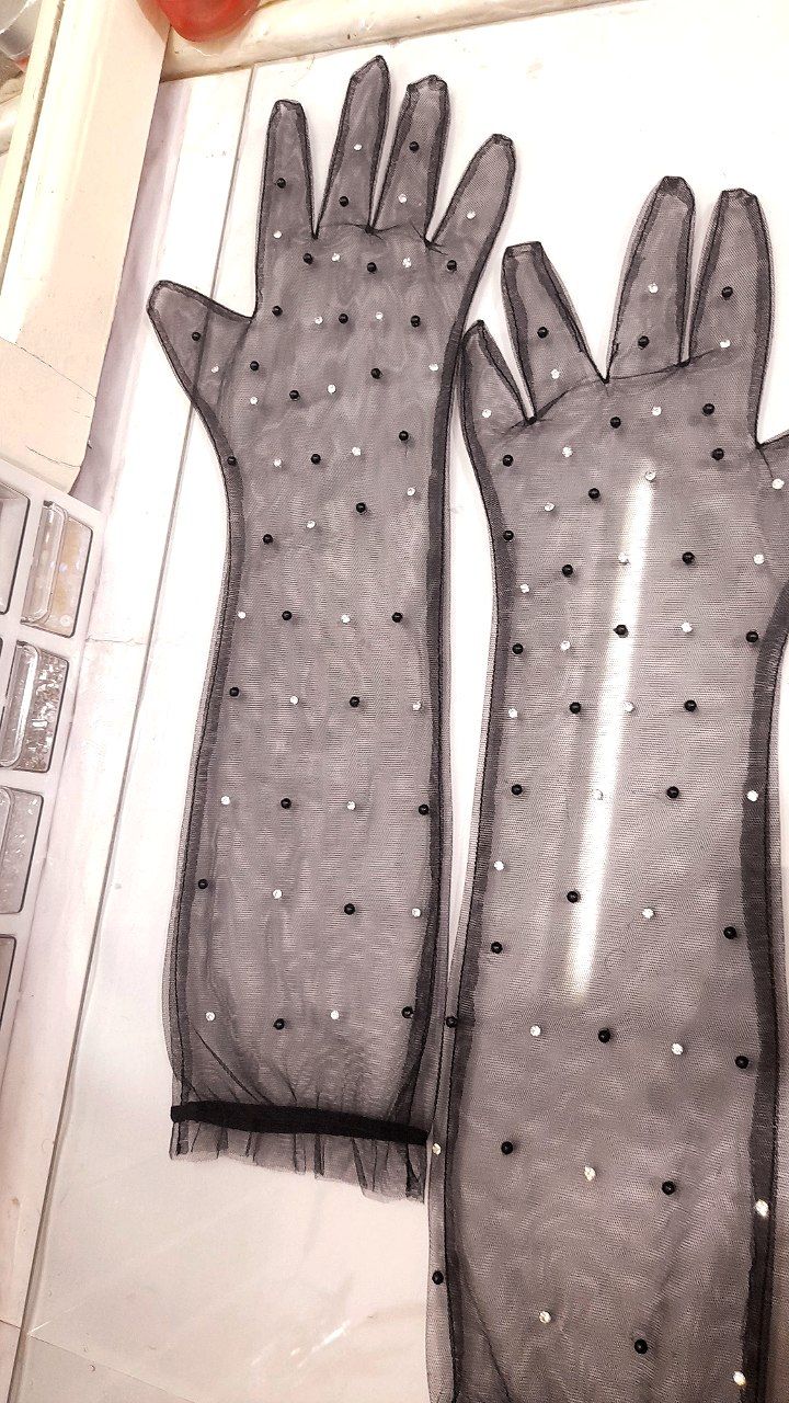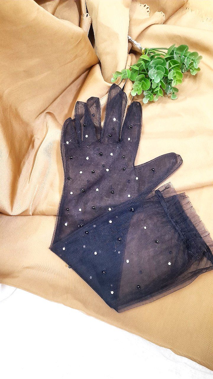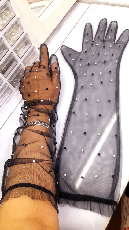 دستکش توری جذاب ساق بلند با دیزاین مروارید و نگین اصل